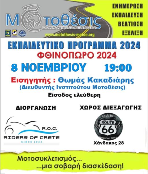 Την Παρασκευή 8/10 στις 19:00 στο χώρο του ROUTE 66 στη Χάνδακος 28 Ηράκλειο, η ομάδα του Μοτοθέσις με εισηγητή τον Διευθυντή του Ινστιτούτου Θωμά Κακαδιάρη, θα πραγματοποιήσει μία ενδιαφέρουσα τοποθέτηση – παρουσίαση του προγράμματος τους. Ενδιαφέρον θα έχει διότι θα αναφερθεί στους λόγους για τους οποίους το συγκεκριμένο πρόγραμμα είναι μοναδικό και αναντικατάστατο όσον αφορά στην οδική μοτοσυκλετιστική ασφάλεια.